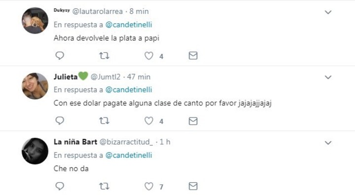 Las redes sociales se volvieron a llenar de fuertes críticas a Candelaria Tinelli, luego de que la cantante publicara una foto limpiándose la nariz con un billete de 100 dólares.