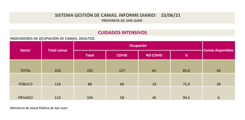 Además, se encuentran internados 260 pacientes en las áreas de COVID-19 (entre positivos y sospechosos) de los hospitales Dr. Guillermo Rawson; Dr. Marcial Quiroga; Dr. Ventura Lloveras, de Sarmiento; Dr. César Aguilar, de Caucete; Dr. José Giordano, de Albardón; Dr. Federico Cantoni, de Pocito; CEMEC; Dra. Julieta Lanteri; Hospital San Roque, de Jáchal; Hospital Dr. Alejandro Albarracín, de Valle Fértil; Hospital de Barreal, de Calingasta; Hospital Privado; Instituto Médico; Clínica El Castaño; Clínica Santa Clara; Sanatorio San Juan y CCI.
