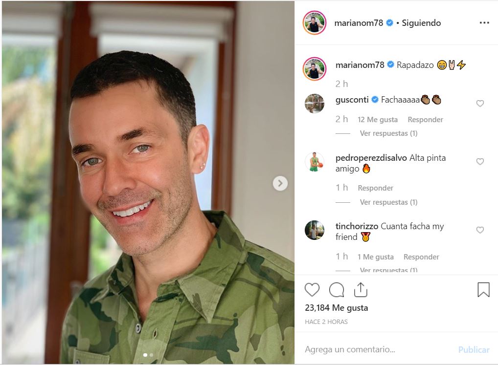 “Rapadazo” escribió Mariano Martínez y mostró el nuevo estilo que llevará por las próximas semanas. El actor que protagonizó el rol de galán en muchas novelas cada día intenta mostrar más en “la onda” y recurre a diferentes herramientas. Entre otras, crear un perfil de snapchat, o de tik tok, hablar con palabras millennials o como ahora, lucir un look bastante jovial.