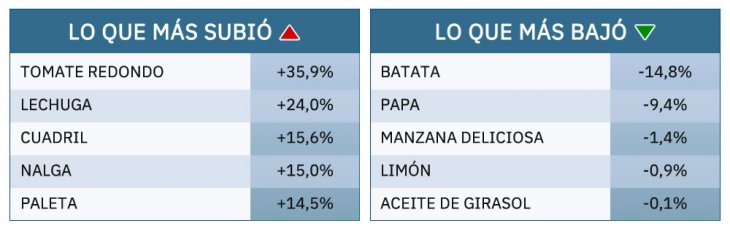 En tanto, los productos que más bajaron en el mismo período fueron la batata (-14,8%), papa (-9,4%), manzana deliciosa (-1,4%), limón (-0,9%) y aceite de girasol (-0,1%).