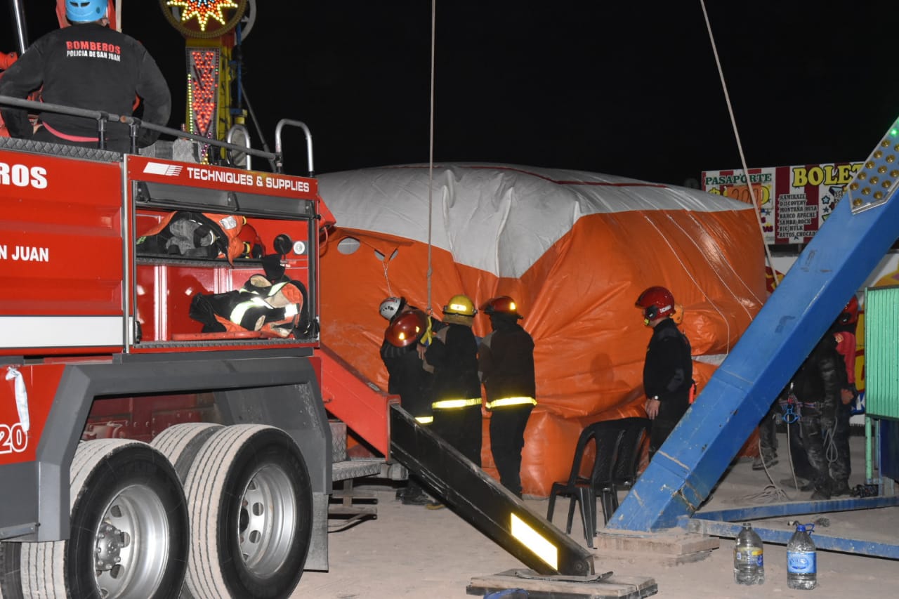 Personal de Bomberos se hizo presente en el lugar con una grúa especial -tiene una jaula- para rescatar una a una a las personas, muchos de ellas chicos. Además se sumaron dos máquinas similares que fueron prestadas por uan empresa constructora.