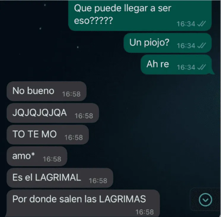 "¿Qué puede llegar a ser eso? ¿Un piojo?", consultó con preocupación la joven protagonista de esta historia y envió una foto de su ojo donde se puede ver un pequeño puntito en el parpado. Ante la insólita pregunta, el amigo de la usuaria se quedó atónito con el mensaje y hasta pensó que era una broma, pero al descubrir que era verdad le respondió entre risas "Es el lagrimal" y le explicó "Es por donde salen las lágrimas".