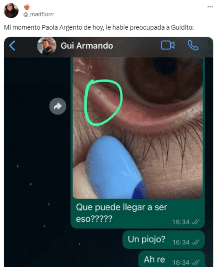Esto es lo que paso a @_mariflorrr, una joven que causó furor en la red social del pajarito porque hizo una inocente pregunta acerca del "extraño punto" que tenía en el parpado del ojo. "Mi momento Paola Argento de hoy, le hable preocupada a Guidito", escribió la chica en su perfil y compartió una captura del chat que mantuvo con su amigo al respecto.