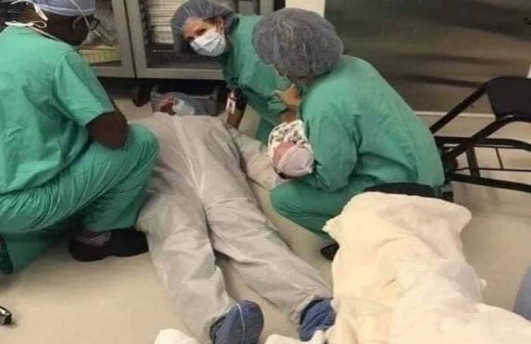 En la selfie en cuestión se puede ver a la flamante nueva madre sonriente, acostada en la camilla y vestida con una bata y una cofia para la cabeza, mientras que detrás de ella se desarrolla un espectáculo. El hombre aparece, vestido apropiadamente para una sala de partos, se puede ver tirado en el piso mientras que lo tratan tres doctores.
