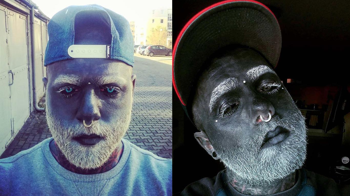 El color que usó en su cara es grafito, y a eso le agregó la barba y las cejas en blanco, para crear el efecto de “hombre negativo”.