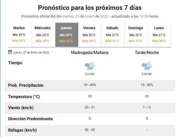 Desde el miércoles el termómetro irá en baja, con una temperatura máxima de 28 grados probabilidad de tormentas aisladas en la madrugada y noche. Durante la últimas horas del día se esperan ráfagas de viento Sur que podrían alcanzar los 59 kilómetros por hora y de esa manera la máxima del jueves descenderá a sólo 23 grados.