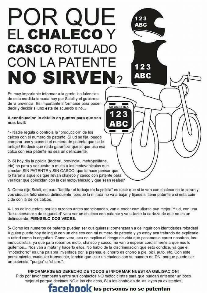 Luego de que se conociera que en breve el Gobierno nacional anunciará que en unos 90 días los motociclistas estarán obligados a llevar la patente del rodado impresa o grabada en el casco, tanto del conductor como del acompañante, al tiempo que este último, además, deberá utilizar un chaleco reflectante con el dominio, motociclistas de todo el país convocaron a una marcha el próximo miércoles para dar a conocer su disconformidad.