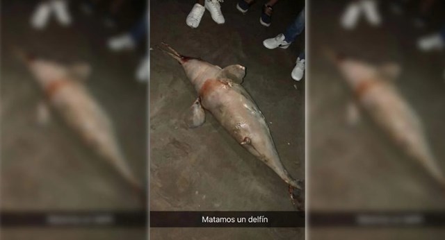 En las historias de Snapchat, luego del diálogo, aparece una foto del cetáceo y la siguiente descripción como leyenda: “Matamos a un delfín”.