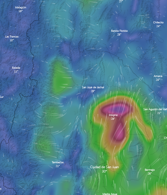 Se puede observar como el ‘ojo’ del viento se da en la zona Norte del Gran San Juan y la velocidad en el centro es de 60 nudos (poco más de 100 km/h)