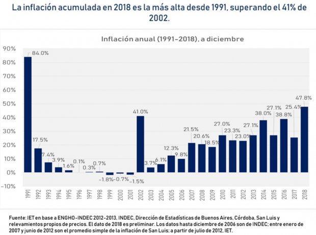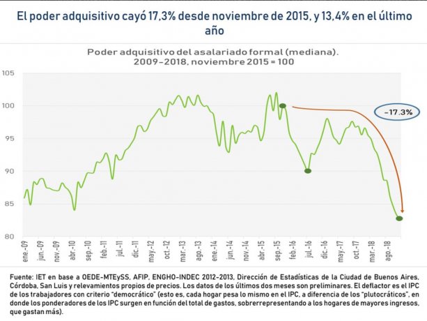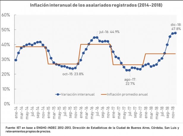 Acerca de la evolución del poder adquisitivo, para el IET, “entre noviembre de 2015 y diciembre de 2018, el salario real cayó 17,3% (la caída más profunda desde la crisis de 2001-2). Durante todo el año pasado, el poder adquisitivo cayó todos los meses desde enero sin haber encontrado aún un piso”.