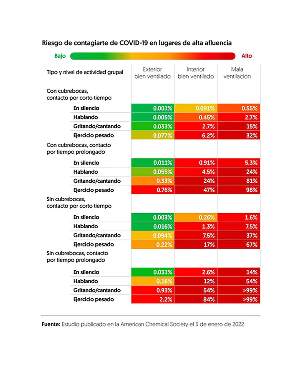 En la revista científica revisada pro pares Environmental Science & Technology se publicó una investigación que da detalles sobre las situaciones y actividades en donde la probabilidad de contagiarse Coronavirus es mayor. De esta manera, las personas sabrán cuidarse dentro de la nueva normalidad que conlleva vivir con el virus.