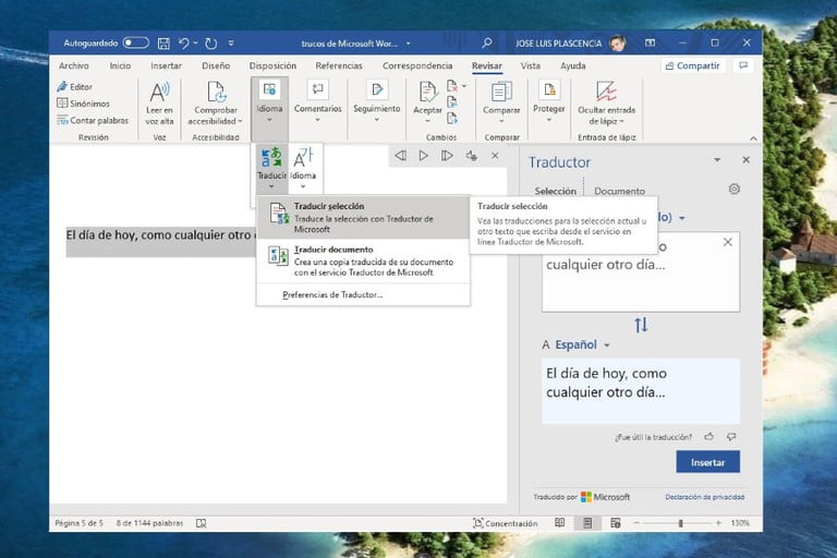Para traducir un texto completo, solo necesitas hacer clic en la pestaña Revisar y seleccionar la opción Idioma. A partir de ahí, Word ofrecerá traducirlo y tú solo acepta. Si esto no funciona, puedes seleccionar la opción en la pestaña Revisar y luego en Traducir. A continuación, se creará una copia más reciente del documento traducido automáticamente.