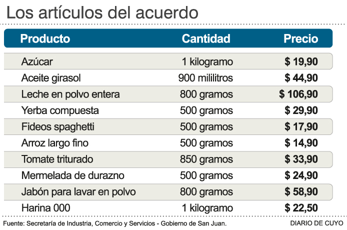 Mientras que en algunas época llegó a incluir hasta 30 productos, incluso muchos de elaboración en San Juan, ahora optaron por una tercera parte de los artículos, apenas 10. Entre ellos hay azúcar, aceite, leche, yerba, fideos, arroz, tomate triturado, harina, mermelada de durazno y jabón para lavar en polvo.