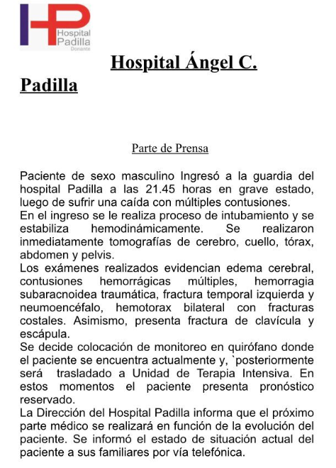 “Paciente de sexo masculino ingresó a la guardia del hospital Ángel C. Padilla a las 21.45 horas en grave estado, luego de sufrir una caída con múltiples contusiones. En el ingreso se le realiza proceso de intubamiento y se estabiliza hemodinámicamente. Se realizaron inmediatamente tomografías de cerebro, cuello, tórax, abdomen y pelvis. Los exámenes realizados evidencian edema cerebral, contusiones hemorrágicas múltiples, hemorragia subaracnoidea traumática, fractura temporal izquierda, y neumoencéfalo, hemotorax bilateral con fracturas costales. Asimismo, presenta fractura de clavícula y escápula. Se decide colocación de monitoreo en quirófono donde el paciente se encuentra actualmente y, posteriormente será trasladado a Unidad de Terapia Intensiva. En estos momentos el paciente presenta pronóstico reservado. La Dirección del Hospital Padilla informa que el próximo parte médico se realizará en función de la evolución del paciente. Se informó el estado de situación actual del paciente a sus familiares por vía telefónica”, expresa el texto.