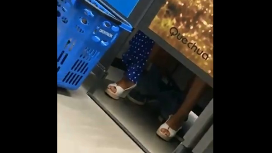 Lo subió el usuario @AgenteSmint, que asegura que le llegó por WhatsApp. En las imágenes se ve la puerta de un probador grabado desde fuera y, en el hueco que hay entre la puerta y el suelo, se ven dos pares de piernas.