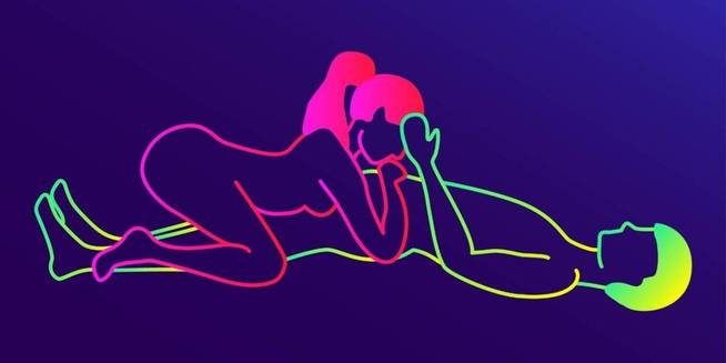 Esta posición es muy cómoda porque reduce la tensión en el cuello y la espalda de la mujer. La logística es la siguiente: él se tumba horizontalmente y ella se sitúa en cuclillas encima de él. Su cabeza está a la altura de la zona sexual masculina. La fémina tiene el torso apoyado en los muslos de él. Con ayuda de las manos, ella puede introducir el pene en su boca sin problemas. Para facilitar el proceso, él puede colocar debajo de su coxis un par de cojines, elevando así su altura y facilitándole el acceso a ella.