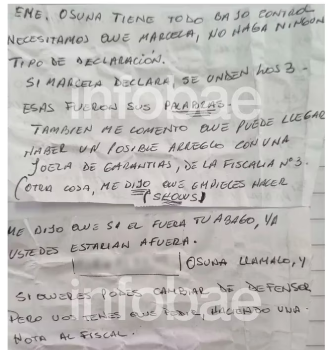 La carta secuestrada no esquiva polémicas e insinúa que hay un “posible arreglo” con una jueza de Garantías. Aquí, menciona al abogado Osuna nuevamente. “Me dijo que si él fuera tu abogado, ya ustedes estarían afuera”, insistió la hermana de Sena quien también anotó su número y pidió que lo contacte.