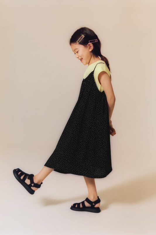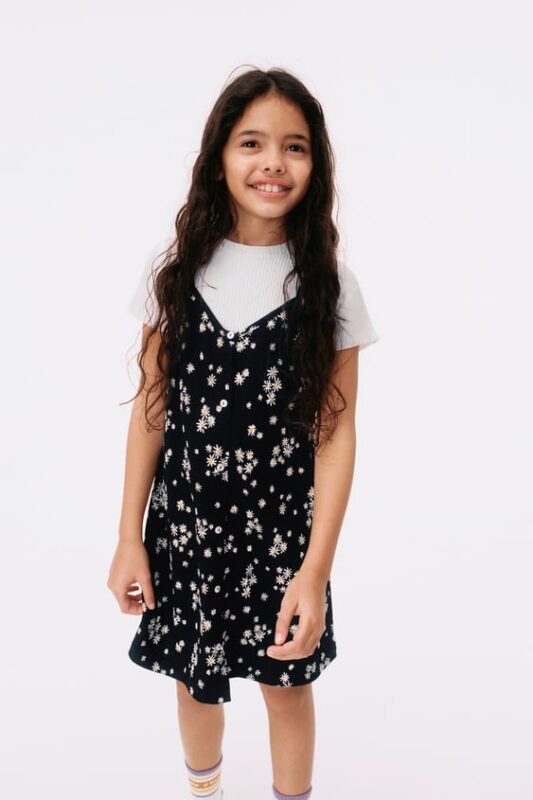 La ropa en capas en las últimas tendencias de vestidos para niños 2023 es imprescindible. Es muy fácil integrar capas en el uso diario como remeras más camisas o chombas más vestidos.