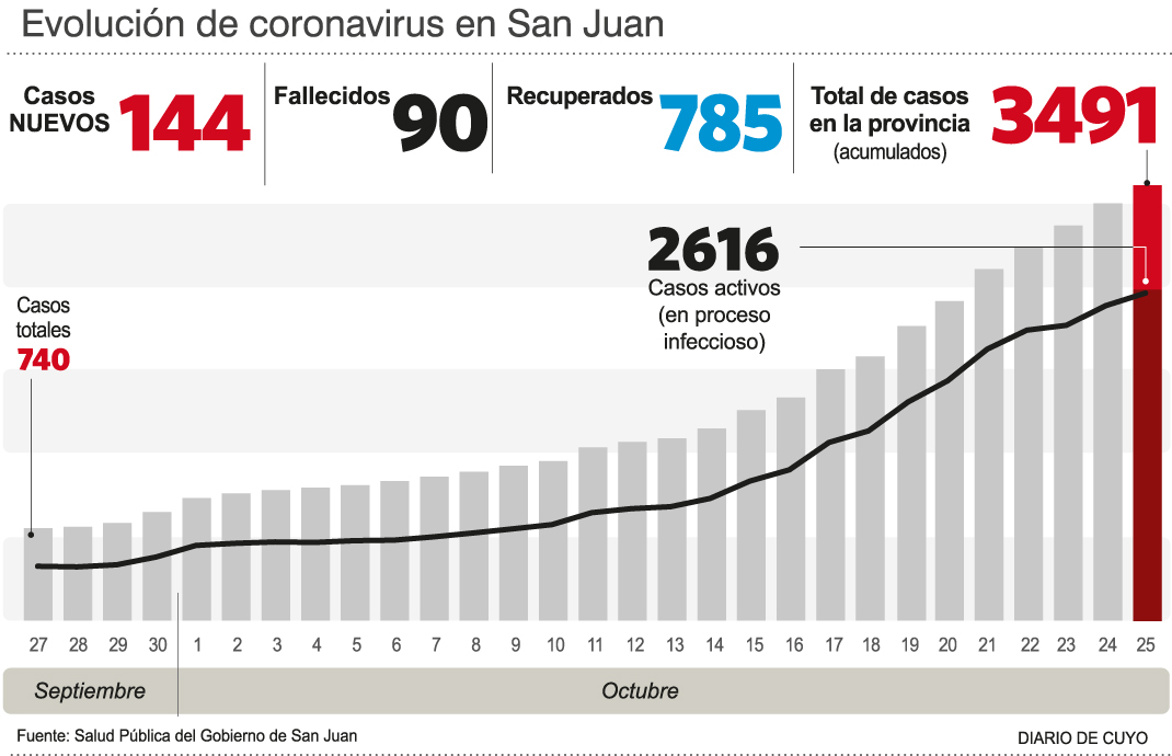 La última vez que San Juan había tenido una jornada tan dolorosa en cantidad de muertes por Covid informadas en un mismo día había sido el 8 de septiembre; mientras que previamente había sucedido una circunstancia similar el 4 de septiembre.