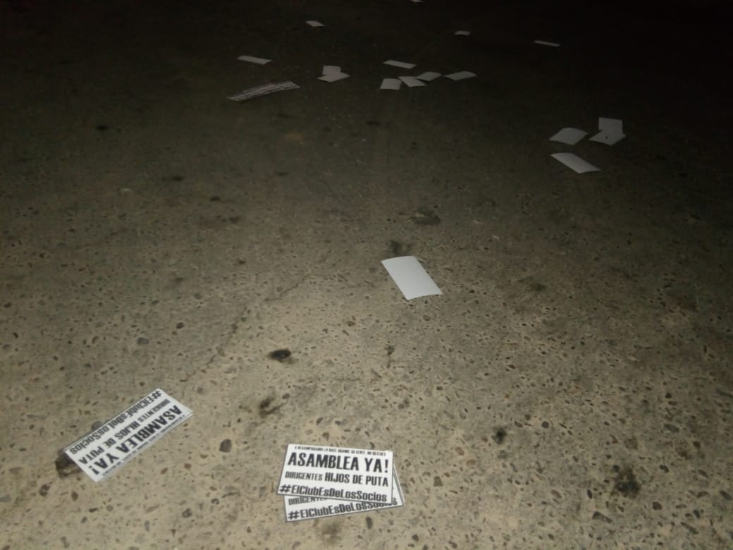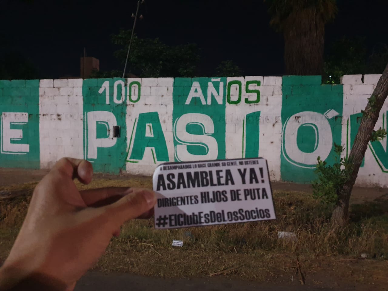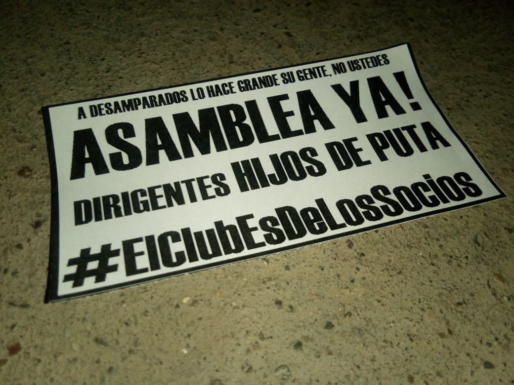 "Asamblea ya! Dirigentes hijos de p…", son algunas de las frases que pueden leerse en el reclamo gráfico que se multiplicó en las inmediaciones del estadio del Víbora. Además, los hinchas aseguraron que "a Desamparados lo hace grande su gente, no ustedes (por los dirigentes)".
