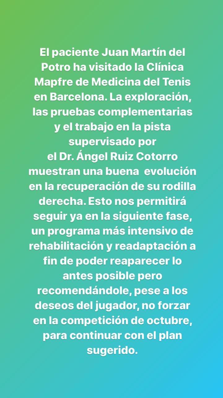 "El paciente Juan Martín Del Potro ha visitado la Clínica Mapfre de Medicina del Tenis en Barcelona. La exploración, las pruebas complementarias y el trabajo en la pista supervisado por el Dr. Angel Ruiz Cotorro muestran buenaevolución en la recuperación de su rodilla derecha. Esto nos permitirá seguir ya en la fase siguiente, un programa más intensivo de rehabilitación y readaptación a fin de poder reaparecer lo antes posible pero recomendándole, pese a los deseos del jugador, no forzar en la competición de octubre, para continuar con el plan sugerido", dice el comunicado que publicó el equipo del tenista argentino de 31 años.