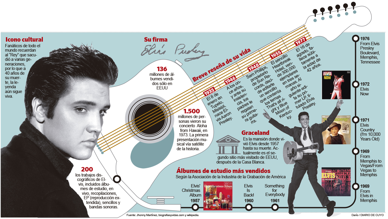 Su fallecimiento conmovió al mundo. Con ese peinado batido, sus trajes ceñidos con flecos, hombreras y pantalones, y sus movimientos de cadera, osados para ese tiempo; Elvis Presley sacudió la escena musical. La muerte lo sorprendió cuando tenía 42 años en su mansión de Memphis; pese a que atravesaba el ocaso de su carrera; así, un 16 de agosto de 1977, se convirtió en "la’ leyenda y varios de sus discos continúan en la lista de los más vendidos.