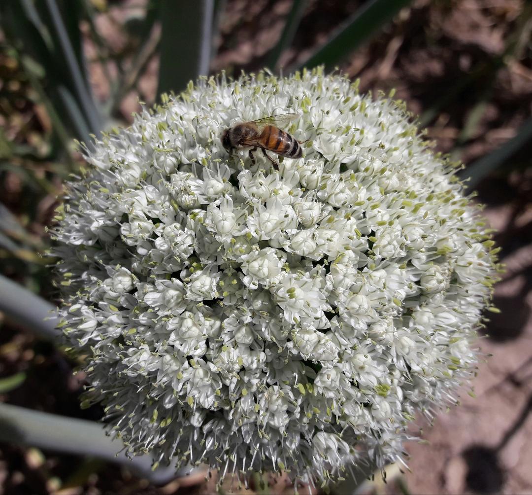 La simple y tranquila labor de polinización de estos insectos beneficia el cuaje de las semillas de cebollas (foto), puerros, zanahorias, hinojos, eneldos y otras especies. Sincronización natural, magia al vuelo, todo programado para resultados benéficos. La vida misma.