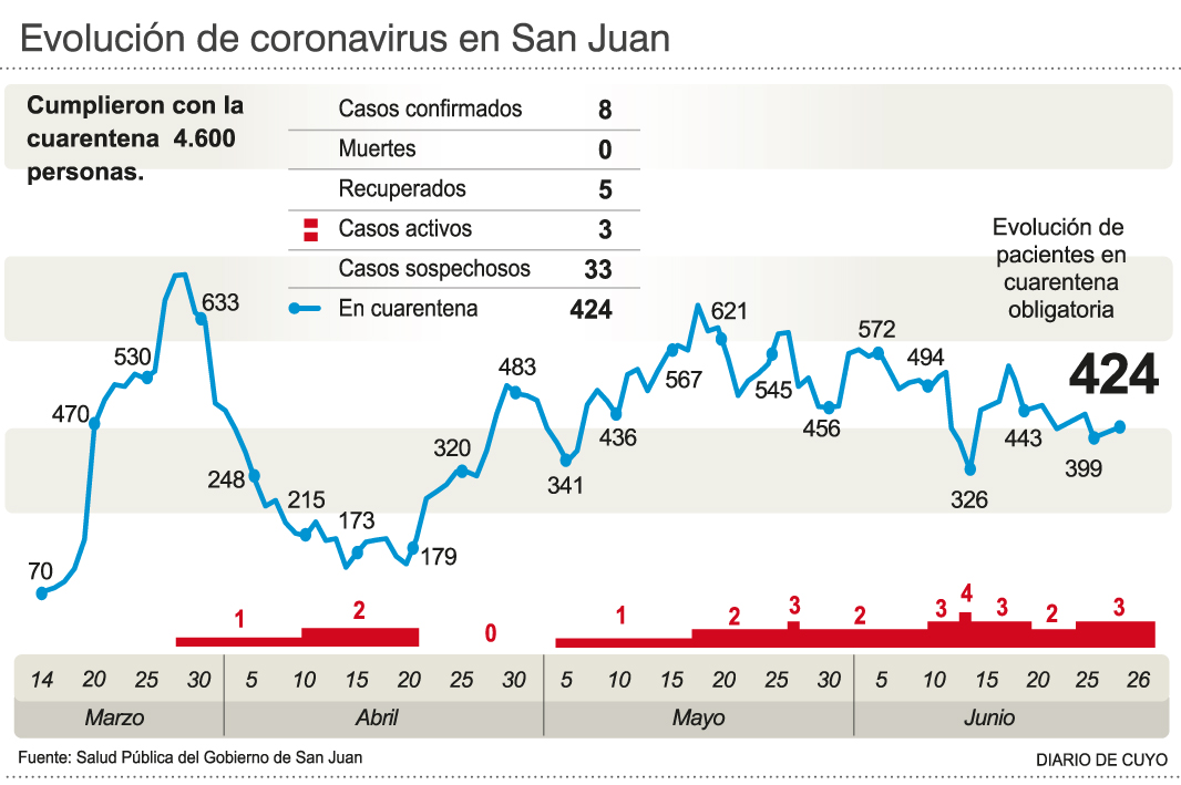 De esta manera, San Juan mantiene 8 casos de coronavirus, de los cuales 5 ya están recuperados; en tanto que hay 33 casos sospechosos y 264 dieron negativo, estableciéndose ayer un nuevo récord de análisis en un mismo día, que previamente era de 240 en 24 horas.