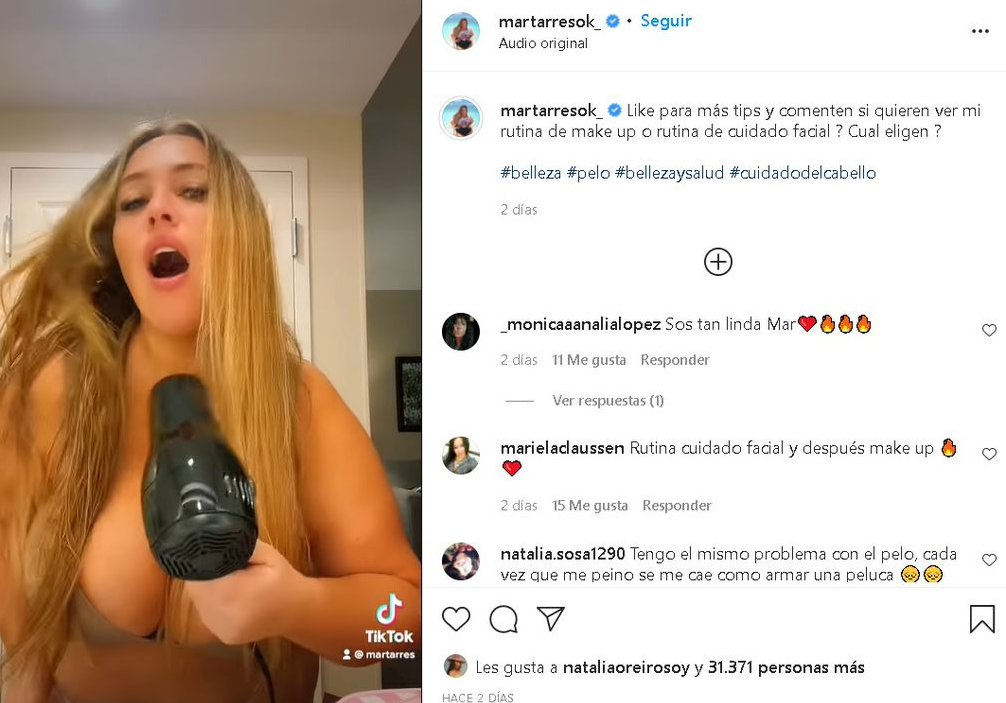 “Foto 1 o 2? Practicando para el only fans ah re”, escribió Tarres en su descripción pidiendo consejos a sus más de un millón de seguidores. Por la forma de expresar esta frase, se puede interpretar que sus dichos eran en forma sarcástico, de manera que su presencia en estas plataformas todavía es una incógnita.