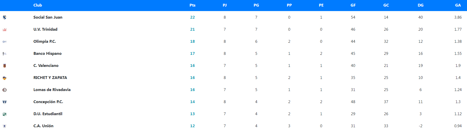 En cuanto a los otros resultados, Olimpia derrotó por 5-3 a Richet y Zapata para trepar hasta el tercer puesto, Banco Hispano le ganó 6-3 a Aberastain y quedó cuarto, Colón Junior venció por 5-4 a Huarpes y Concepción vapuleó por 8-1 a Estudiantil Sub-23.