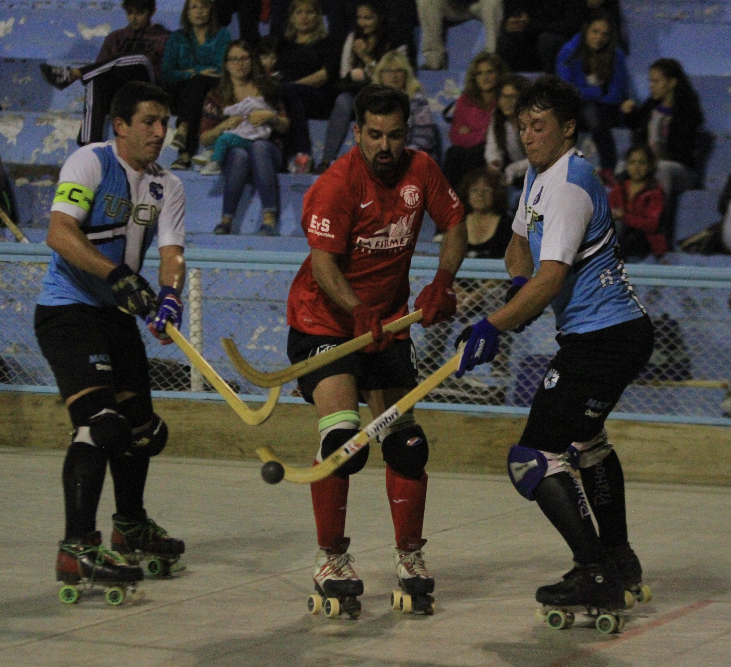 ¿Pasará? Juan Manuel Ortega, de Huarpes, trata de encontrar un hueco entre Juan Travasino y Mauricio Montaño, ambos de Social San Juan. Al final, el Decano goleó a Huarpes y se subió a la punta aunque sea momentáneamente.