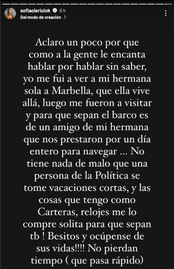 Por eso, en las últimas horas escribió un descargo donde lo defendió tras el escándalo por las fotos y videos en el lujoso yate. “A la gente le encanta hablar por hablar sin saber. Yo me fui a ver a mi hermana sola a Marbella, luego me fueron a visitar. El barco es de un amigo de ella y nos lo prestaron por un día entero para navegar”, empezó explicando en su cuenta de Instagram.
