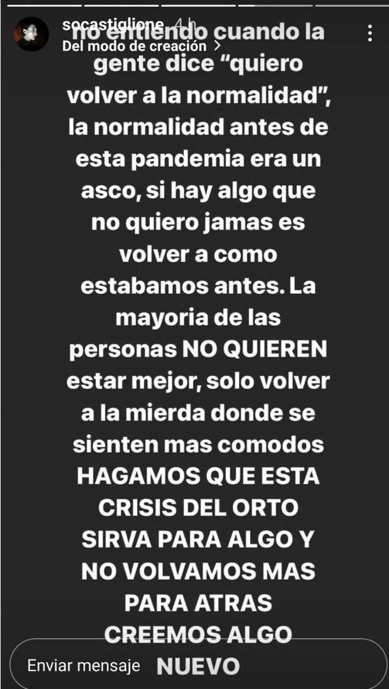 La hija de Moria Casán se expresó a través de su cuenta de Instagram y en una de sus historias publicó un texto en donde afirmó que “la normalidad antes de esta pandemia era un asco”.
