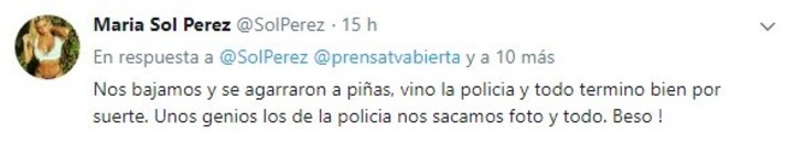 Y agregó en un segundo y último tweet: “Nos bajamos y se agarraron a piñas, vino la Policía y todo terminó bien por suerte. Unos genios los de la Policía nos sacamos foto y todo. Beso!”.