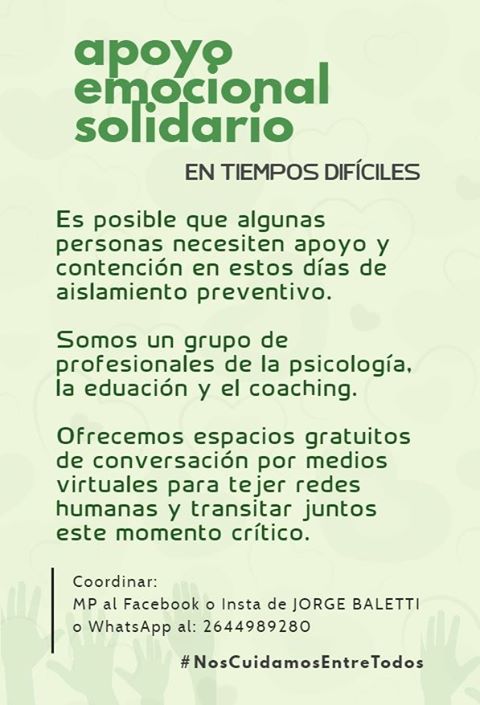 “Con un grupo de profesionales de la psicología, el coaching y docentes estamos llevando a cabo una acción de apoyo emocional por vías virtuales (teléfono, chat, videollamada, zoom, skype, etc.). Está dirigido a cualquier persona que en este contexto de asilamiento y crisis sienta la necesidad de compartir sus inquietudes y hablar de sus emociones. Es completamente gratuito y anónimo”, escribió Jorge Baletti.
