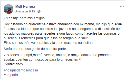 "Estando en cuarentena estuve charlando con mi mamá, me dijo que seria fabulosa la idea de que nosotros los jóvenes nos pongamos a disposición de los adultos mayores para hacerles algún favor. Ellos son los más vulnerables y los que más nos necesitan", relató en torno al modo en que se le ocurrió la idea.