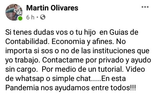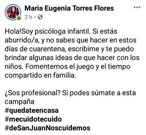 Desde este viernes el país vive una situación inédita: la de la cuarentena total que implementó el Gobierno de la Nación para tratar de contener la expansión del coronavirus. En ese contexto, algunos profesionales sanjuaninos utilizaron las redes para poner a disposición de todos sus servicios en forma gratuita. Desde psicólogos, pasando por docentes y hasta personas dispuestas a salir a hacerles las compras a quienes integran los grupos de riesgo escribieron sus mensajes.