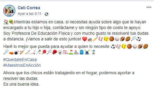 "Soy profesora de Educación Física y con mucho gusto te resolveré tus dudas a distancia. Mientras estamos en casa, si necesitas ayuda sobre algo que le hayan encargado a tu hijo o hija, contactame y sin ningún tipo de costo te apoyo. ¡Vamos a salir de esto juntos!", escribió.