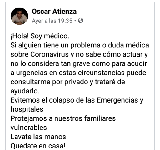 "Evitemos el colapso de emergencias y hospitales. Protejamos a nuestras familas", pidió Oscar Atienza, a quien se puede contactar a través de la cuenta de Facebook con su nombre.