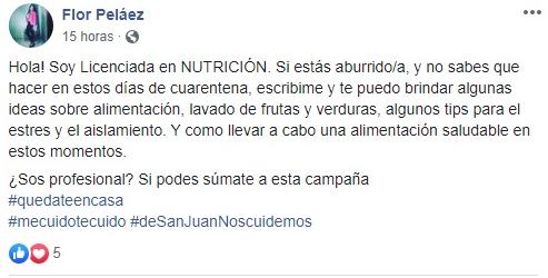 "¡Hola! Soy licenciada en Nutrición. Si estás aburrido/a, y no sabes que hacer en estos días de cuarentena, escribime y te puedo brindar algunas ideas sobre alimentación, lavado de frutas y verduras, algunos tips para el estres y el aislamiento. Y como llevar a cabo una alimentación saludable en estos momentos", escribió Flor Peláez, quien invitó a otros profesionales a sumarse a la medida.