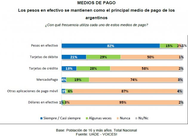 En último lugar, los argentinos eligen como medio de pago el uso de dólares en efectivo: menos del 1% de la población dice utilizarlos siempre o casi siempre.