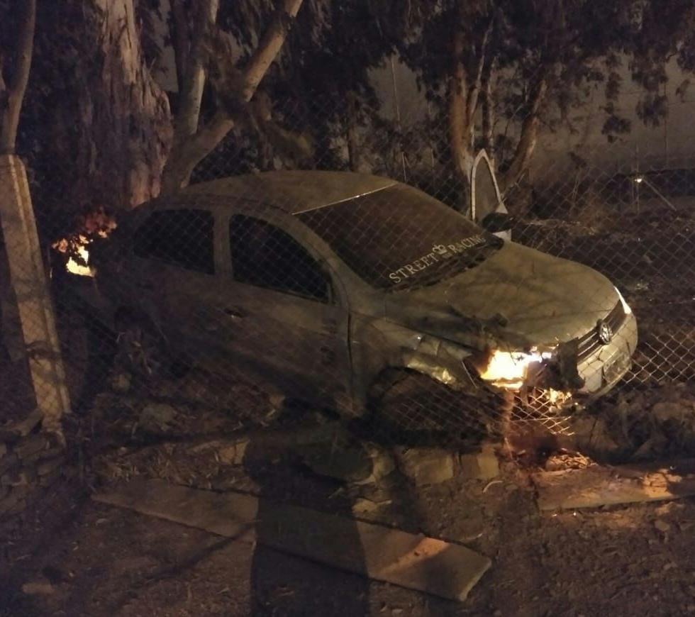 El conductor de un Volkswagen que conducía a alta velocidad ayer a primera hora por Meglioli y Cabot impactó primero con un cartel vial y luego contra un eucalipto y finalmente un alambrado. Sin embargo, el hombre salió ileso del choque.