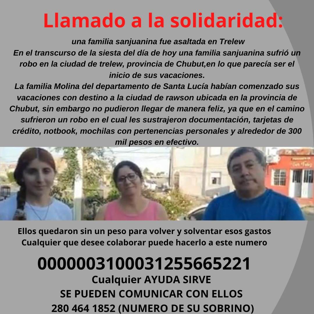 Ante la situación, los sanjuaninos siguieron hasta su destino y se acercaron a hacer la denuncia. El caso causó tanta sorpresa allí, sobre todo por el lugar en el que se produjo el robo, que la familia incluso fue entrevistada por radios locales, desde donde iniciaron una campaña para pedir donaciones, con el fin de que la familia pueda regresar a San Juan.