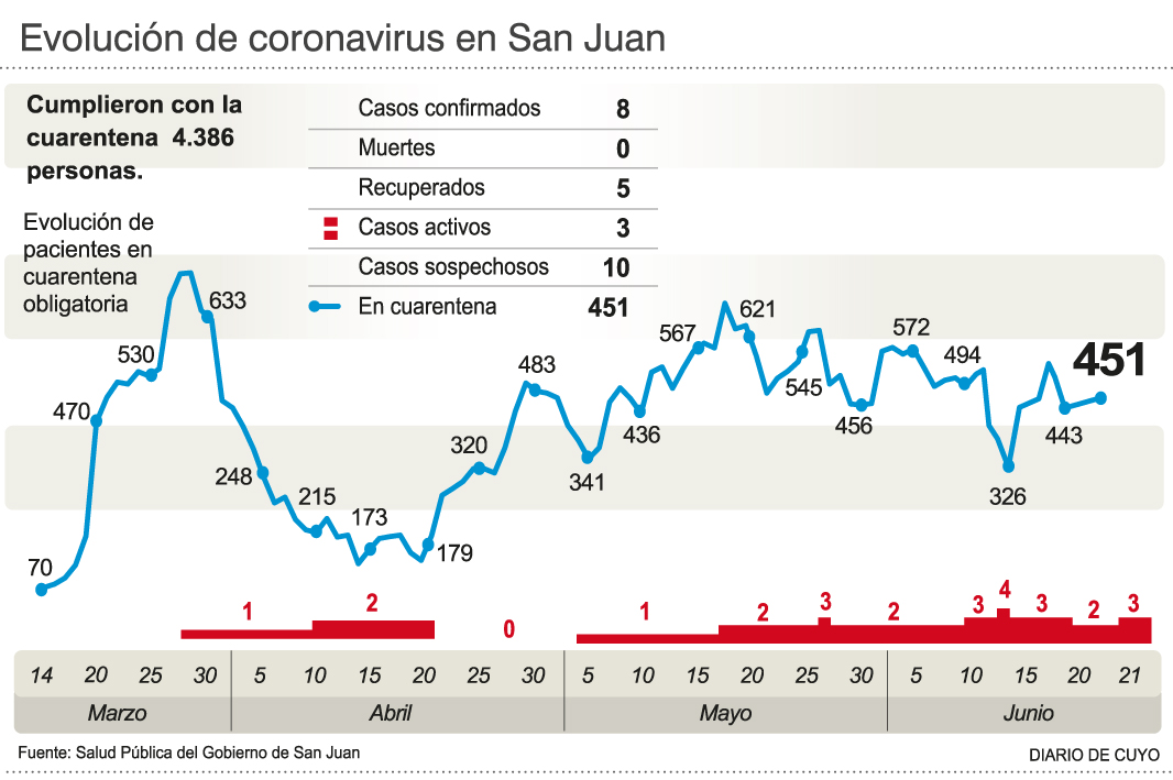 Son tres los sanjuaninos que tienen la enfermedad en curso, dos de ellos asintomáticos: el transportista conocido ayer y el joven estudiante que llegó desde el exterior. En tanto que el médico neumonólogo continúa internado y recuperándose. Hasta ayer eran 10 los casos sospechosos.