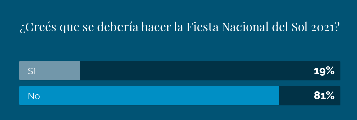 Ante la pregunta “¿Creés que se debería hacer la Fiesta Nacional del Sol 2021?”, realizada a través de una encuesta de DIARIO DE CUYO, el 81 por ciento de quienes opinaron eligieron la opción “No”. Mientras que solo el 19 por ciento restante optó por la respuesta “Sí”.