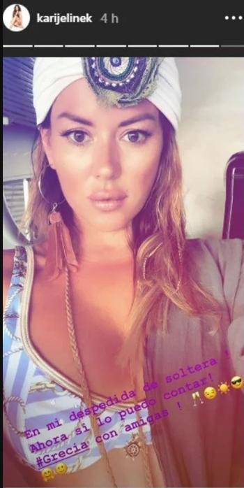 Karina Jelinek generó un gran revuelo en las redes sociales con un particular anuncio. La morocha publicó una foto en sus historias de Instagram en la que está muy relajada y feliz en medio de una escapada a Europa. Junto a la imagen, la diosa argentina hizo una aclaración muy importante: "En mi despedida de soltera. Ahora sí lo puedo contar. #Grecia con amigas".