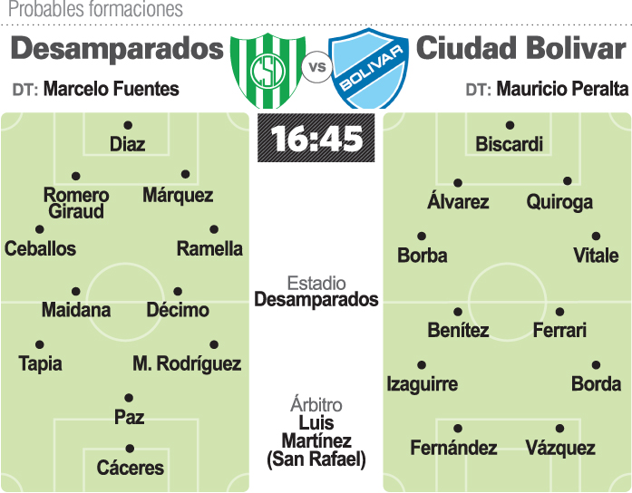 En tanto que en Puyuta y desde las 17.45 horas, Desamparados se jugará una carta clave para su futuro cuando reciba a Ciudad Bolívar. Sportivo viene de caer ante Villa Mitre y hoy está fuera de la zona de clasificación. Encima se medirá con un rival que viene de ganarle a Olimpo y que hoy tiene su última chance para seguir con vida pero eso solo lo conseguirá con un triunfo. En lo deportivo, Fuentes hará dos variantes con el ingreso de Darío Ramella por Zuliani y de Mateo Rodríguez por Bruno Rodríguez buscando reforzar la marca en la banda izquierdo. Con eso Sportivo ante su gente, buscará reencontrarse con la imagen de los dos últimos encuentros disputados en su cancha para seguir soñando con la clasificación.