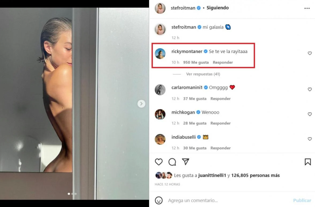 “Se te ve la rayitaaa”, le puso el hijo de Ricardo Montaner, haciendo alusión al lugar exacto donde terminaba su provocativa foto de espalda. Por supuesto, el resto de sus amigos se deshicieron en elogios tales como “hermosa”, “mamasita hermosa”, emojis de fuego y caritas con corazones.