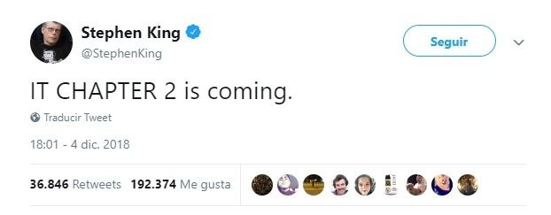 Actualmente, Muschietti prepara la secuela y Stephen King no se mantuvo al margen. A través de sus redes sociales anunció la llegada de este segundo capítulo.