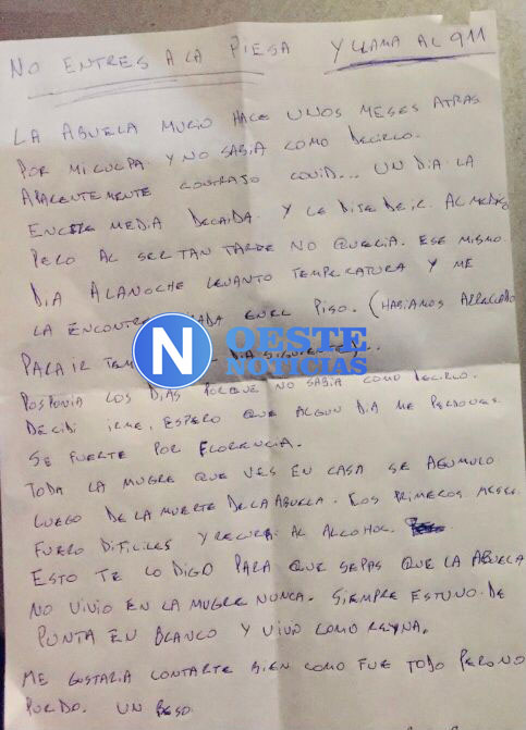 En la carta que el joven dejó para su familia, confesó que su abuela falleció en el mes de marzo, pero por miedo la acostó en la cama y no avisó a nadie. El mismo había viajado a Chascomus y regresó por falta de dinero. Él era quien percibía la pensión de la jubilada.